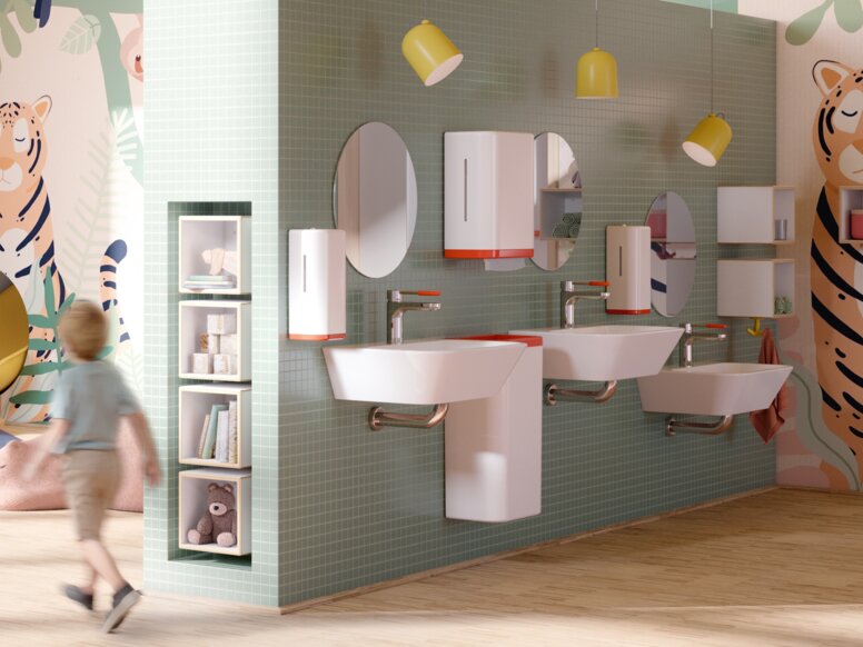 Vollständig ausgestattet sind Sanitäranlagen in Kitas und Kindergärten mit weiteren Spenderlösungen, z. B. für Papier und Mülleimer. Abgerundete Kanten und farbige Rahmenelemente sorgen für mehr Sicherheit und setzen stimmige Farbakzente.