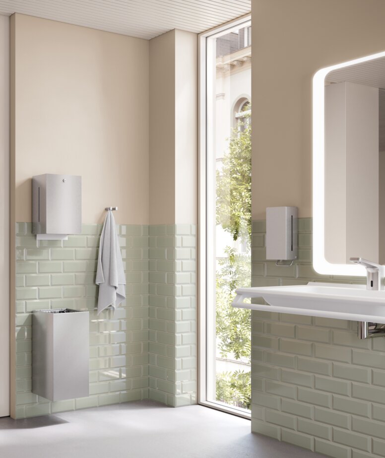 Von Seifen- und Papierhandtuchspendern über Hygienekombinationen bis hin zu Abfallbehältern in verschiedenen Größen bietet HEWI ein durchgängiges, funktionales Sortiment, das höchste Designansprüche mit langlebiger Qualität verbindet.