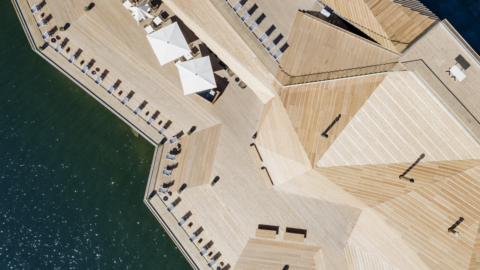Good to know: By the way, löyly is the name of the steam that is created when water is poured onto the hot stones in a sauna. Due to the loose and facetted construction of the building, it blends into the part of the park and appears less than a conventional building. The light-coloured wood turns grey with time and thus takes on the colour of the rocks on the shore. The architectural idea behind the löyly sauna is simple. The central point of the whole construction is a rectangular box. This is where the sauna and restaurant rooms are located.
