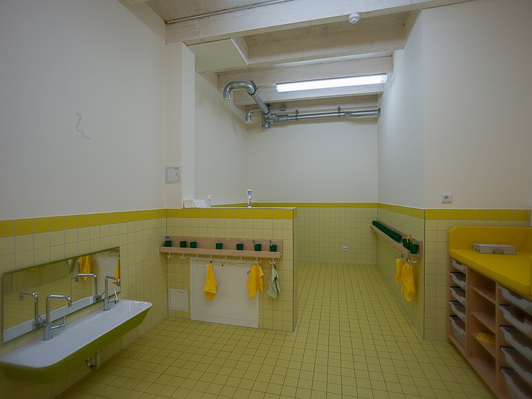 The range of solutions in the KITA in the worsted spinning mill includes washbasins, mirrors, fittings, toothbrush cup holders and accessories such as soap dispensers or toilet roll holders. In the KITA in the worsted spinning mill, barrier-free equipment solutions in the sanitary rooms also help the children to use them.
