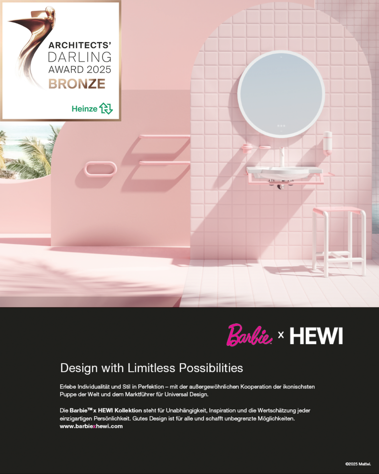 HEWI was honoured with bronze in the "Best Advertisement" category at the Architects' Darling Award 2025 for the campaign for the Barbie™ × HEWI collection.