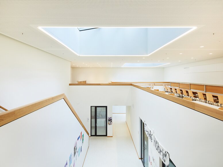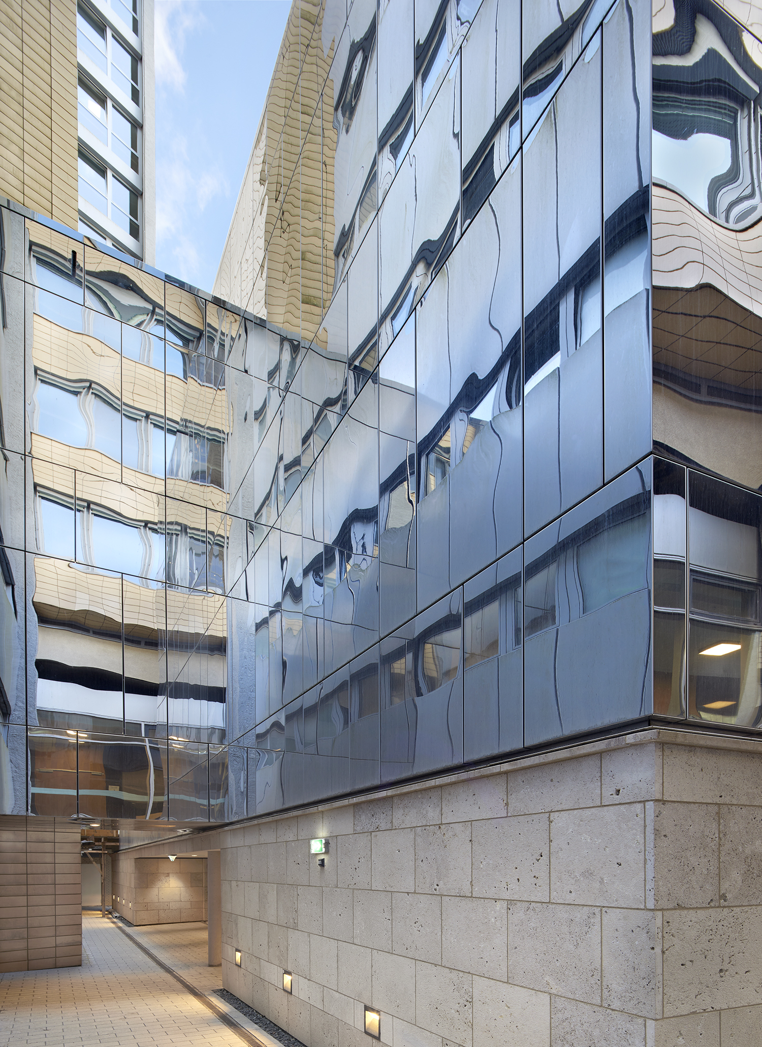In addition to the refurbishment of the existing building, the usable space was to be expanded. The newly created "Cube" is a free-standing solitaire in the inner courtyard, spread over three storeys and provides around 900 square metres of space for additional student workstations and exchange between the student councils. The new extension is characterised by a polished stainless steel façade, which creates interesting effects and visual relationships thanks to its reflective properties. The façade contributes to a harmonious interplay of old and new by mirroring the historic façade and presenting itself in a visually restrained yet modern way. On the upper floor of the new building there is a light-flooded hall which, together with the four seminar and committee rooms on the ground floor, can also be used for events. The new building is connected to the existing building via bridges on three sides on the ground floor. Newly created meeting rooms in the listed main foyer and the refurbished canteen with an open-plan concept and new energy-efficient building services complement the uses on the ground floor.