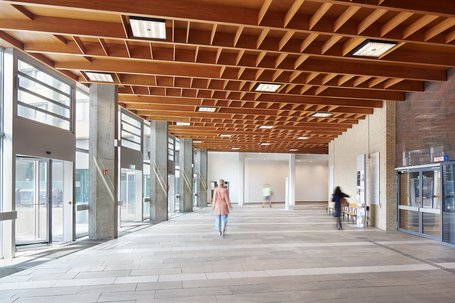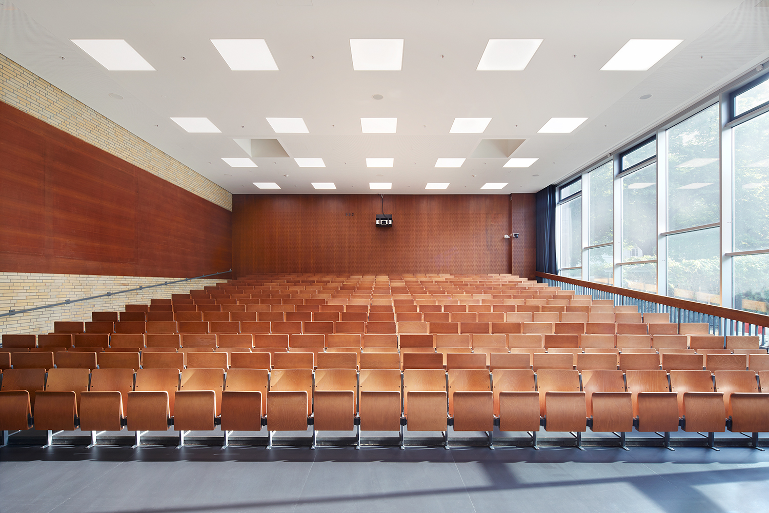The Philosophers' Tower has a Z-shaped floor plan with four building sections and is characterised by its slender construction in the "Mid-Century Modern" style. The façade makes the building appear weightless and emphasises the vertical structures. The two wings house the faculties' seminar and student council rooms and offices. The centrepiece of the high-rise building and a major innovation is the merging of the previously separate libraries into a central library covering over 6,000 square metres, which now extends from the second to the sixth floor of the central middle building. An additional staircase and a library lift gave the library its own internal access.