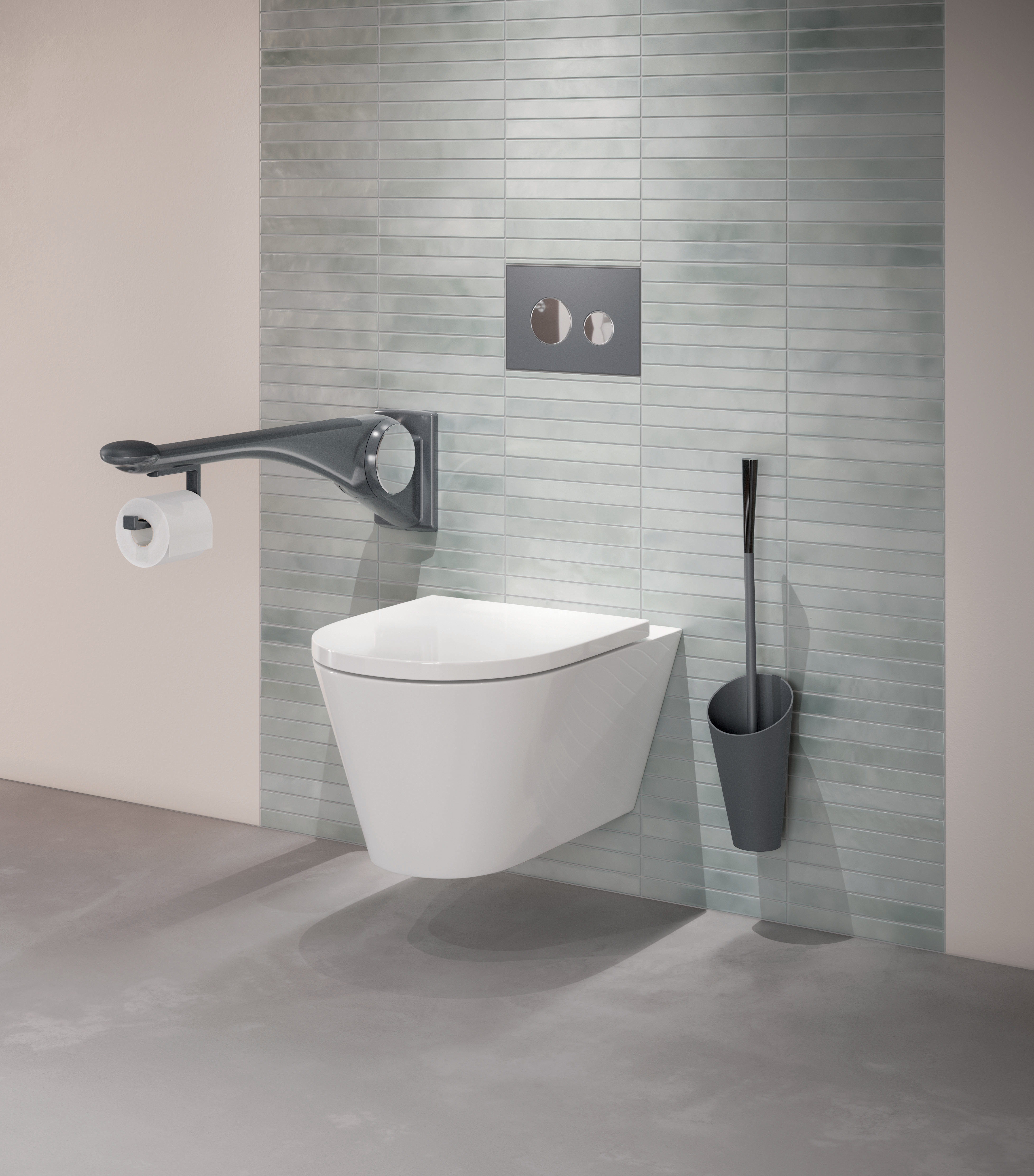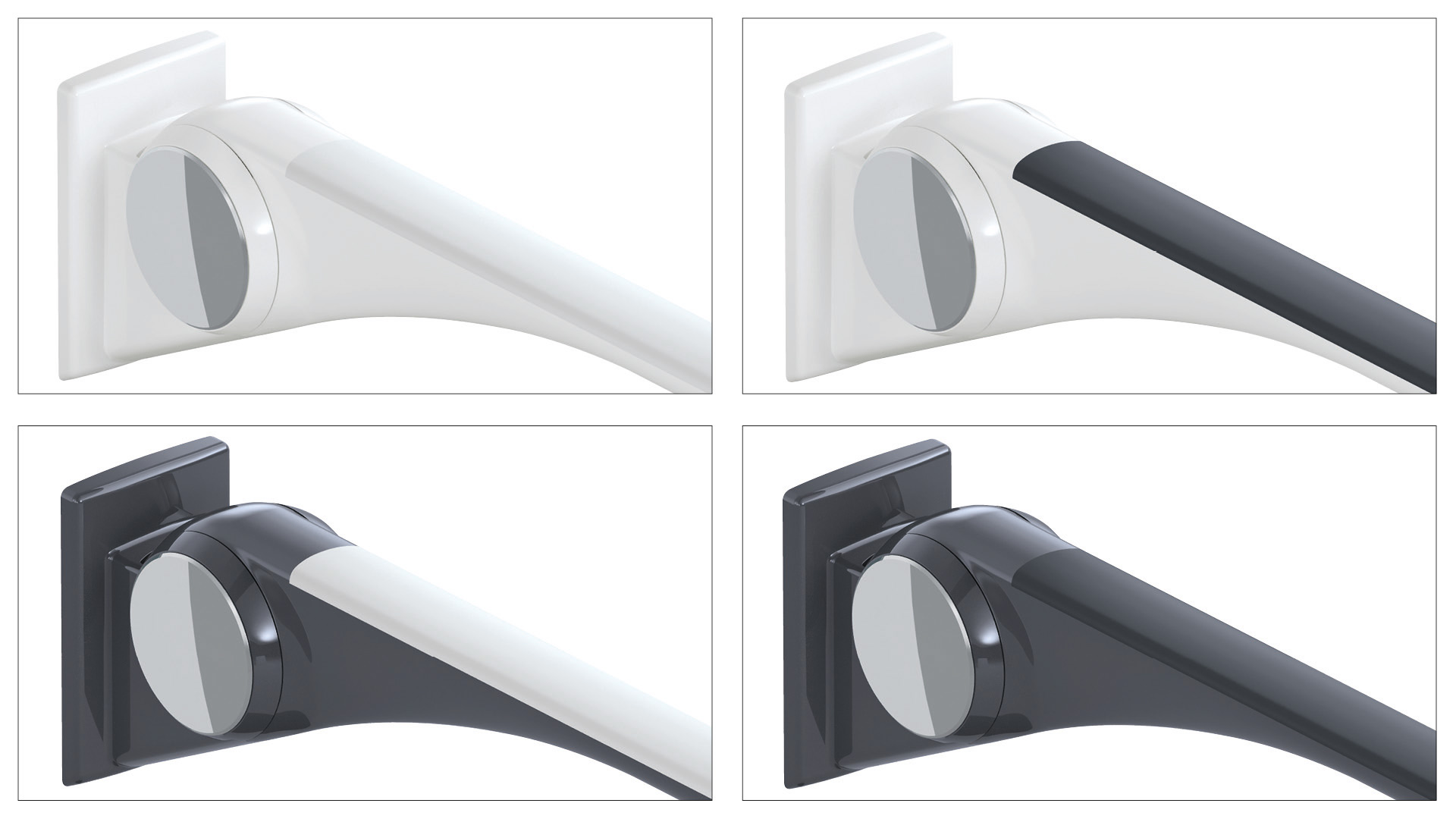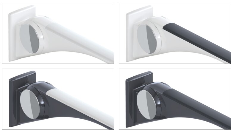 In terms of design, the new design focuses on the combination of matt and glossy surfaces. Glossy, smooth surfaces are particularly hygienic. Matt surfaces, on the other hand, impress with their soft feel and provide a better handle. The hinged support rails can be ordered in different colour variants according to individual wishes. The selection includes white-white, white-anthracite, anthracite-white and anthracite-anthracite. The surface of the bracket is glossy powder coated. The surface of the handle pad is matt. This combines the aspects of hygiene and haptics in one product and increases comfort and convenience for the user. To support this, the grip pads can be purchased with a non-slip, ergonomically shaped, raised grip piece. The highlight is the chrome disc on the joint, which provides reflective accents.