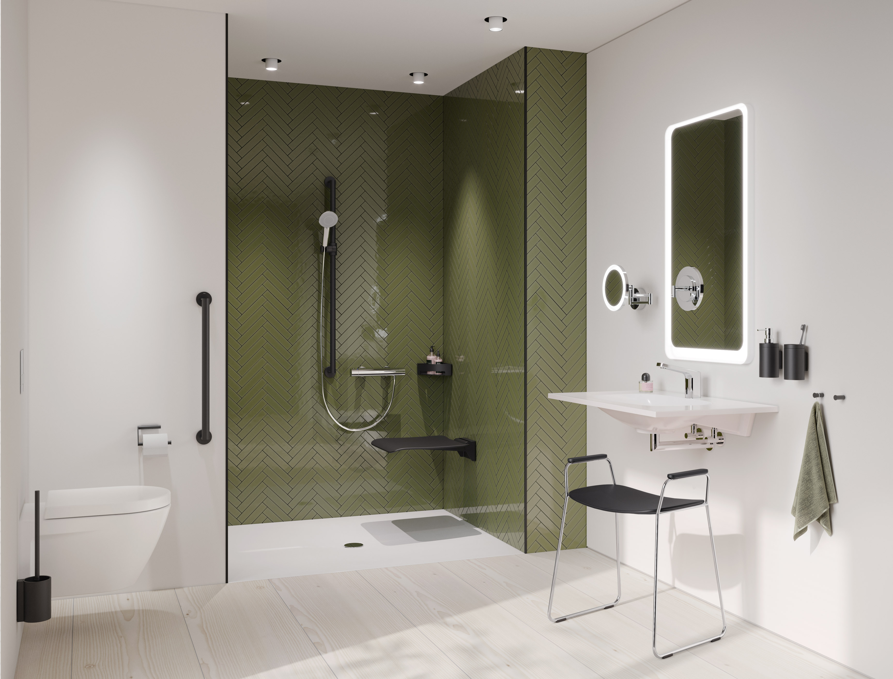 Two stools and two bath chairs are part of the new seating family. They have small, special additional functions, such as a towel rail or various holding options. A model with armrests is also available to provide a feeling of safety in the bathroom. This security is also reflected in the seating feeling. The stool and bath chair optimally adapt to the shape of the body and support a stable sitting position. The small stool in particular is especially suitable for narrow bathrooms due to its small footprint. Thanks to the high quality of the products, they are versatile - both in the private sanitary room and outside. In terms of colour, the models available for selection in grey and black as well as in white tones integrate optimally into existing room concepts or set contrasting accents.