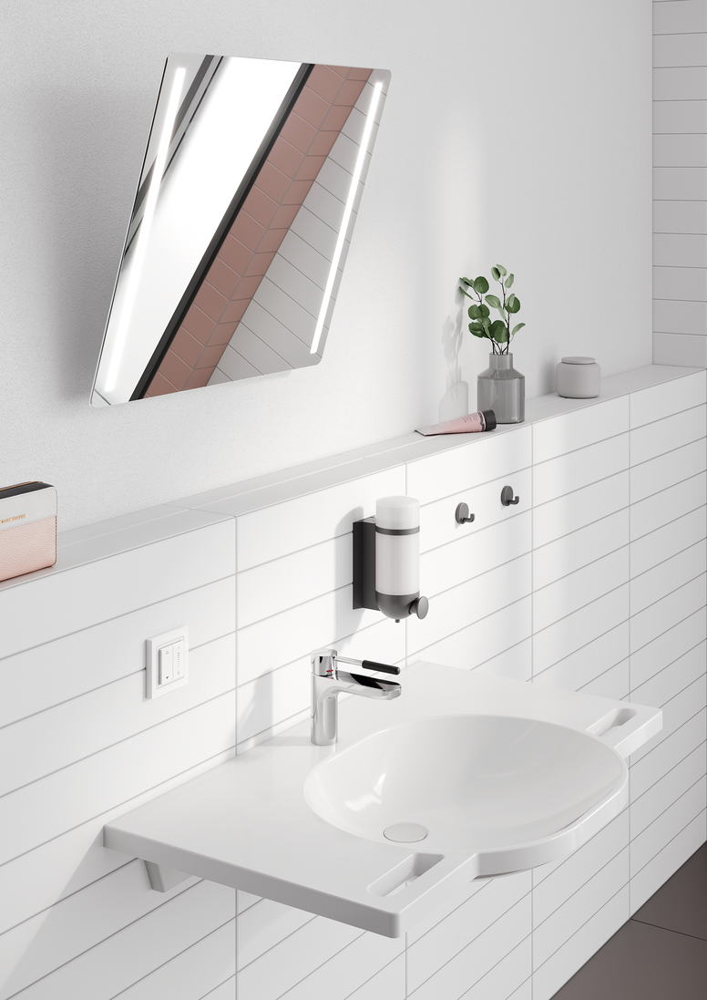 An alternative is a full-length bathroom mirror that extends up to the top edge of the washbasin. These are suitable for both standing and seated users. The HEWI bathroom mirror range includes both wide and narrow models. This means that bathrooms with sloping ceilings can also be fitted.